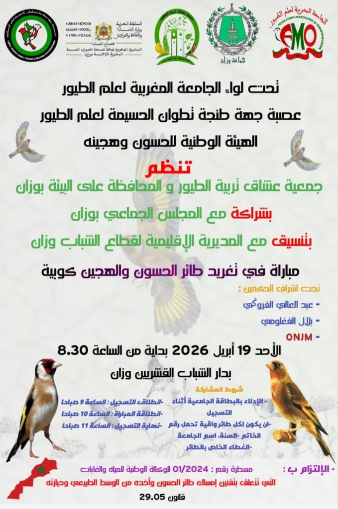 تنظم جمعية عشاق تربية الطيور والمحافظة على البيئة بوزان، بتعاون مع المجلس الجماعي لوزان، وبتنسيق مع المديرية الإقليمية لقطاع الشباب والثقافة، وبشراكة مع الجامعة المغربية لعلم الطيور وعصبة جهة طنجة تطوان الحسيمة، مباراة في تربية وتغريد طائر الحسون والهجين كوبية، وذلك يوم الأحد 19 أبريل 2026، ابتداء من الساعة 8:30 صباحا، بفضاء دار الشباب القشريين بمدينة وزان.